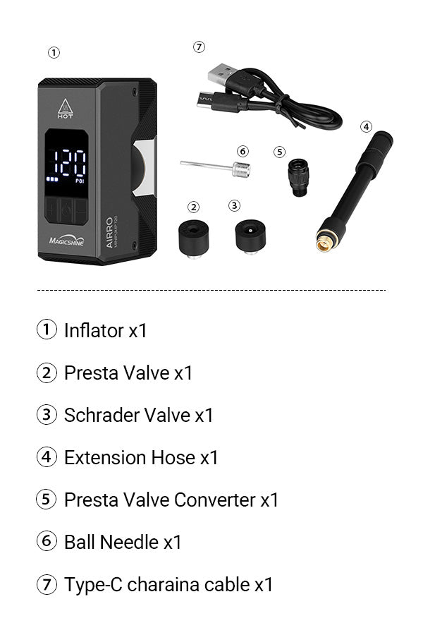 45-minute fast charging via Type-C port, ensuring quick power-ups. - Include adapters for Presta and Schrader valves, as well as ball needle and a hose extender for added versatility.