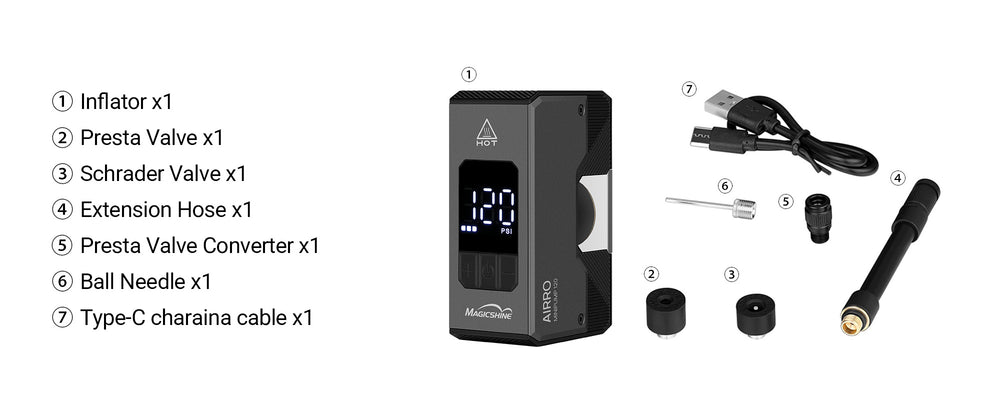 45-minute fast charging via Type-C port, ensuring quick power-ups. - Include adapters for Presta and Schrader valves, as well as ball needle and a hose extender for added versatility.