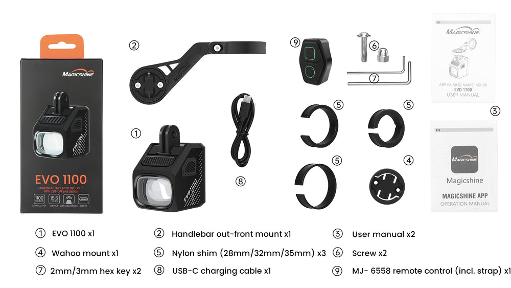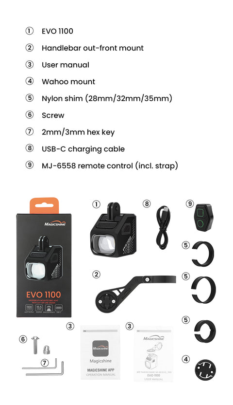 The EVO 1100 is the newest addition to Magicshine's EVO series, packing an impressive output of 1100 lumens in compact housing. Smaller and lighter than the EVO 1700, it meets the needs of road riders and commuters with precision. Its maximum output ensures visibility and safety in all conditions.
